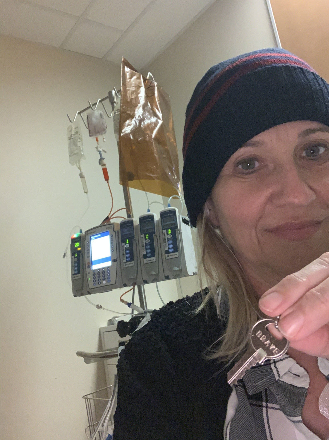 When I received my key a few weeks ago and read about gifting the key I looked at my word BRAVE and immediately thought of Karie. On Christmas Day, I gave her the key and she took this photo the following day on her first day of chemo. Hopefully this key will encourage her when she is alone in Houston facing this extraordinary battle.