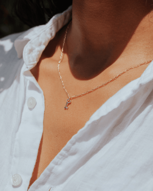 Emerald Cut Gemstone and Mini Key Necklace in Gold