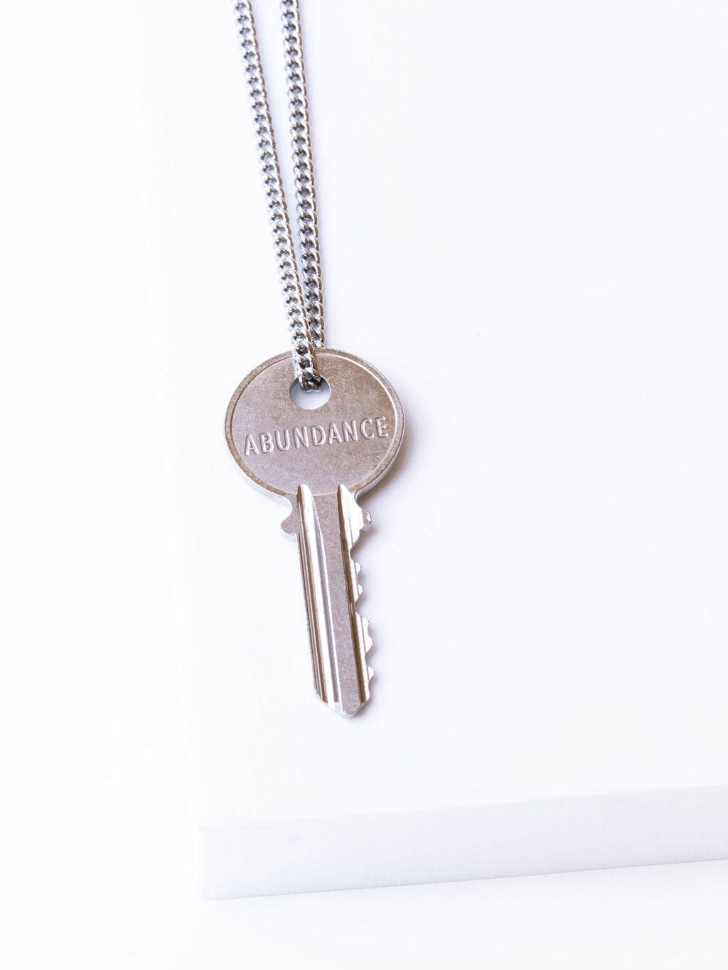 Chain features a matching logo tag and a hand stamped key with the word ABUNDANCE